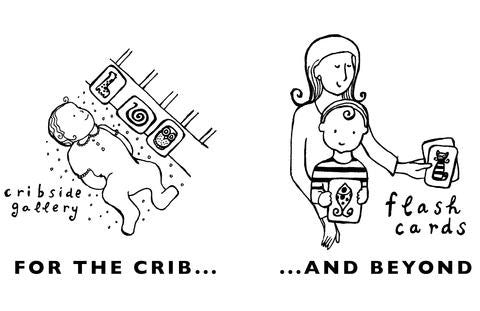 More than just entertainment, visual focus on a stimulus such as art cards can foster a sense of calm and coherence in visually busy spaces. A card placed over a diapering area can be used to redirect attention of wiggly infants, making diaper time a little easier on parents and caregivers. Furthermore, intriguing imagery invites commentary and conversation, encouraging adults to engage more with baby.