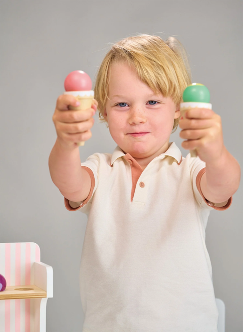 A mini shop with three wooden toy cornets and three ice cream scoops, to mix and match in a pretend play shopping game. Create your perfect ice cream cornet by pressing the red button and letting the scoop drop magically down on to the cornet!