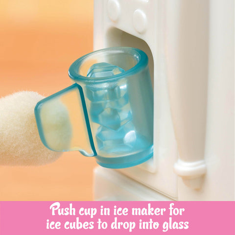 - Features furniture and accessories with functional features, including a flushable toilet, sink with running water, refreigator with ice dispenser and more.