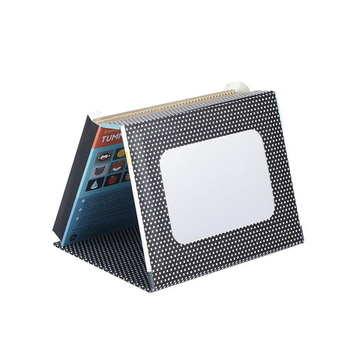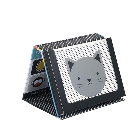 To set up for tummy time, flip open the simple stand-up easel box to display the art cards, or turn it around to the mirrored side for more fun and exploration. The collapsible stand includes 6 double sided high contrast art cards and a baby safe mirror.